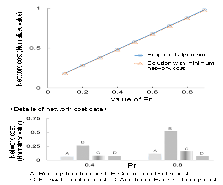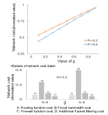 <Reason> The smaller the Pr is, the smaller the volume of traffic that is passed by the packet filtering function. This reduces the routing function cost and the bandwidth cost. In Figure 7, the total of the firewall function cost and the packet filtering function cost for the cases of Pr=0.4 and Pr=0.8 is more or less the same as that for the case of no additional packet filtering function. However, both the bandwidth cost and the routing function cost are reduced by half.