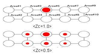 <Reason> The smaller the g is, the greater the effect of statistical multiplexing. This results in a smaller demand for bandwidth. As shown in Figure 11, all types of cost other than the bandwidth cost for the case of g=0.4 are more or less the same as those for g=0.8. However, the bandwidth cost is almost halved. Moreover, as g becomes smaller, it becomes more advantageous to allocate routing functions for inter-area relay traffic. As a result, the final allocation of the routing functions for this type of traffic becomes more distributed, as shown in Figure 12. As shown in Figure 13, the smaller Zc is, the smaller the network cost. Moreover, as Zc becomes smaller, the amount of reduction in the routing function cost becomes larger, making it more advantageous to allocate routing functions for inter-area relay traffic, as shown in Figure 14.