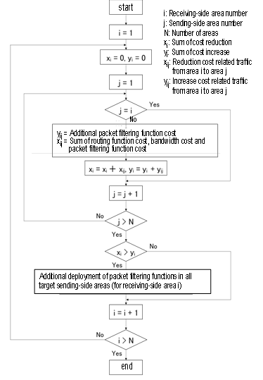 Although the additional deployment (not moving) judgment on the packet filtering function could be performed on each sending-side area, it is assumed in this study that all target sending-side areas are collectively carried out. Here, the target sending-side area is an area where the traffic is generated for the receiving-side area. The following judgment is performed independently for each receiving-side area from an area with a small area number. If the network cost can be reduced when the additional deployment is performed only for the packet filtering function in all target sending-side areas, additional deployment is made to all target sending-side areas. The capacity of the packet filtering function additionally deployed is determined as the amount of traffic towards the receiving-side area from each sending-side area. If the network cost cannot be reduced, it is not additionally deployed. Figure 3 shows the additional deployment judgment flow of packet filtering function.