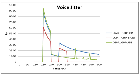 The OSPF_IGRP_EIGRP scenario is better voice jitter from among the two other scenarios as seen in Figure 9, where a jitter is a variation in delay time of received packets.
