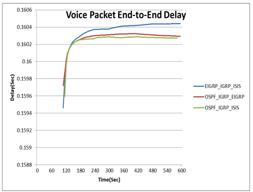 The OSPF_IGRP_ISIS scenario outperforms the two other scenarios in terms of the voice packet end to end delay as shown in Figure 11 therefore it is faster for sending a packet from source to destination over the network. We can see from Figure 9 to Figure 11 that the OSPF_IGRP_EIGRP scenario is better slightly than the OSPF_IGRP_ISIS scenario for voice service. Therefore, The OSPF_IGRP_ISIS scenario fits the real time applications such as voice and video conferencing.