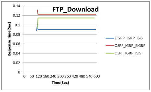 The response time of The EIGRP_IGRP_ISIS is the best performance than the two other scenarios as shown in Figure 12 since it is the fastest one for the FTP downloading service.