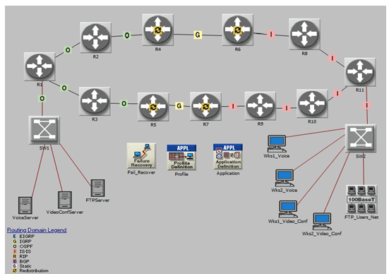 Furthermore, our proposed network consists of an Ethernet local area network (LAN) in which is connected with a SW2 switch via a 100BaseT link. A LAN is configured to support 25 users for using FTP with a low load. We have four Ethernet workstations in the proposed network that are used to support the real time applications, where the two workstations have been configured for a voice service with a low quality and silence suppressed, and the other two have been configured for a video conferencing service with a low resolution video. . In order to analyse the network convergence duration time of the proposed network, we applied a Failure Recovery node that is the simulator of fails in nodes or links of the real communication networks. The links between the following nodes: R11->R8, R6->R4, and R4à2 are an important communication link in the proposed network due to the path between source and destination nodes is the shortest path (R11->R8->R6->R4->R2->R1) as compared with the other path (R11->R10->R9->R7->R5->R3->R1), so during our simulations, we apply failure recovery events as shown in Table 1, where the time is given in second. The total simulation time for each scenario is taken to be 600 seconds.