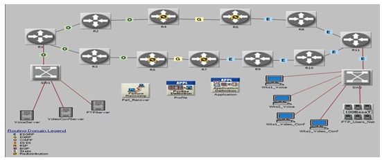 We have used the OPNET 17.5 to create the proposed network as shown in Figure 1. In the proposed network, we have 11 routers that are Ethernet4_slip8_gtwy, and all the routers are connected together with point to point (PPP) by using Digital Signal 3 (DS3) link model, where DS3 link speed is 44.736 Mbps, whereas the R4, R5, R6, and R7 routers are the border routers which are used for exchanging different route information in the network, in addition, we have SW1 and SW2 switches that are Ethernet16_switch node model and are connected with the two end points in the network by a 100BaseT link in which operating at 100 Mbps. Figure 1 shows three Ethernet servers that are connected with SW1 switch via an Ethernet connection, where a VoiceSerever is used to provide a voice service, a VideoServer is used to support a video conferencing, and an FTPServer is used to provide a File Transfer Protocol (FTP) service.