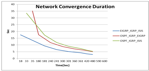 Figure 4 shows the convergence time of the EIGRP_IGRP_ISIS scenario that has a better performance than the other scenarios since it has less convergence time before failures to be occurred in the network and after network recovery among the other scenarios. Therefore, the convergence duration time in the route redistribution among three protocols EIGRP, IGRP, and IS-IS is the fastest one in network convergence time.