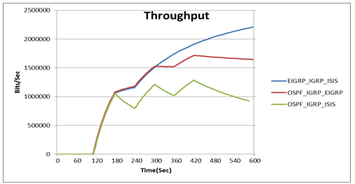 Figure 6 shows the throughput of the link between SW2 and R11, where the throughput is the average number of packets successfully received by the receiver channel per seconds. At the beginning the three scenarios have the same throughput, thereafter failure or recovery in links are occurred as shown in Table 1, we can see the OSPF_IGRP_EIGRP that has higher throughput than the others, but the EIGRP_IGRP_ISIS becomes better in terms of the throughput after three times of failure or recovery occurrences as shown in Figure 6, thus the throughput of the EIGRP_IGRP_ISIS scenario is better than the other scenarios, in case of multiple links failure or recovery are occurred in the network.
