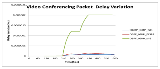 The EIGRP_IGRP_ISIS scenario is more stable than the others due to the difference between the values is closed to zero therefore it is the best performance in terms of the packet delay variation as shown in Figure 7.