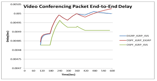 Figure 8 demonstrates the end to end delay of video conferencing service, where the end to end delay is the taken time to transmit a packet over the network from the sender to the receiver. As seen in Figure 8, the OSPF_IGRP_ISIS scenario has less packet end to end delay before failure or recovery in the links are occurred and after occurrence consequently it is better than the other scenarios in terms of the video conferencing end to end delay. We conclude from Figure 7 and Figure 8 that the EIGRP_IGRP_ISIS scenario is better slightly than the OSPF_IGRP_ISIS scenario for video conferencing service.