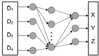 Figure 1. A general feed-forward neural network structure with 4 inputs and 3 outputs.
