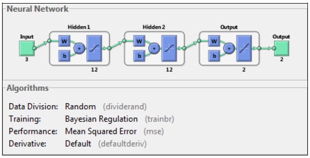 Matlab has been used for the implementation of the MLP neural network (a feed-forward ANN) with three layers. The best solution chosen (refer to Section 4) is shown in figure 2 comprising of three inputs, twelve nodes in the first and second (hidden) layers, and two nodes in the output layer. RSSI values acquired from the 3 anchor nodes are fed as the input to the system, while the output generates the estimate of the x and y coordinates of the mobile node.