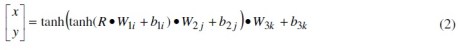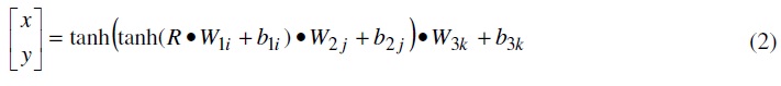 Where Rij signifies the RSSI values of the signal obtained from the jth anchor, at the ith reference point while Xi and Yi signify the x and y coordinates of the ith reference point. For this research, the total number of reference points (m) is 94 and the number of anchors (n) used is three. The neural network obtained is represented by the equation as follows: