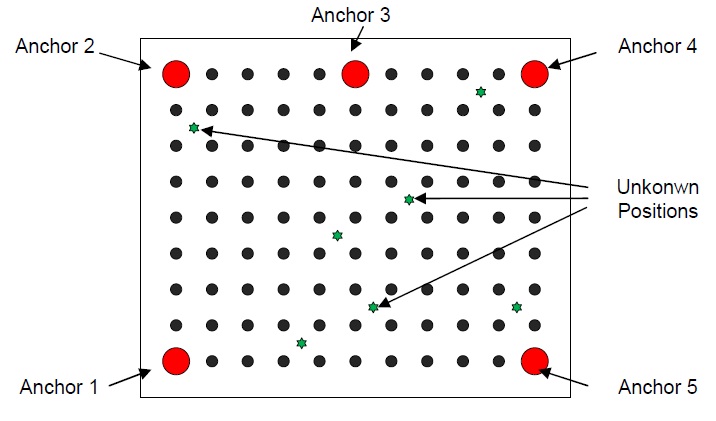 Consider the case when N number of sensor nodes is deployed in a sensor network with locations L = {L1, L2, …, LN}. Let Lxi, Lyi, Lzi, denote the x, y and z coordinates of the ith sensor node respectively. The problem of node localization involves determining these locations and by letting Lzi = 0, problem of 2 dimension is obtained. Sensor nodes having knowledge of their positions are known as anchors or beacons. All nodes in the network with unknown position localize themselves with the aid of these anchor nodes. Therefore, mathematically the node localization problem is stated as follows: for a given a multi-hop WSN, represented by a graph G = (V, E) with A anchor nodes having positions {xa, ya} for all a ɛ A, we want to determine the position {xu, yu} for all nodes with unknown positions u ɛ U.