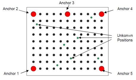 An experiment was carried out to determine the best training algorithm to be used for training the neural network and was performed using 4 anchors. The data structure used for training is mentioned in Section 2 and consists of 2350 data sets of which 80 percent was used for training and validation while 20 percent was used for testing. The network was then further tested for its performance using 105 data sets obtained from 7 unknown positions (see figure 4). The performance of the network is evaluated based on the error in the distance between the estimated and exact distance. Equation 3 is used for calculating the average error.