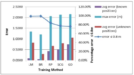 For obtaining the best neural network for localization, the BR training algorithm is evaluated to give the best result. However, the training time for this algorithm is quite high compare to other methods such as LM, RP and SCG. Therefore, it is recommended to use the BR method when offline training is performed as in this case. For applications requiring online training, the LM method is recommended.