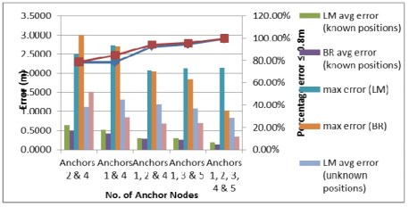 Figure 7 shows the localization errors of the neural network for the different anchor node configurations, where the BR and LM training algorithms have been used to train the neural network. It can be noted that increasing the number of anchor nodes increases the localization accuracy. The lowest average error of all the configurations evaluated was obtained with five anchor nodes. The maximum error for neural network obtained using LM training algorithm is almost same when three, four or five anchors are used. For the two different configurations with three anchors evaluated, the second configuration with anchors one, three and five produced a slightly better result compared to that of when anchors one, two and four are used.