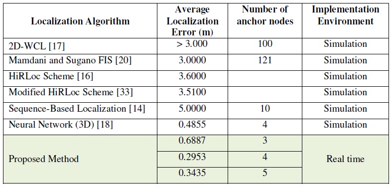 In [18], a neural network approach for 3D localization of nodes using 4 anchor nodes is presented. Average localization error of 0.4855 m for 2D movement was reported. For 95% of the mobile nodes, a localization error of less than 0.8 m was achieved. A 10-10-3 neural network structure having four inputs was employed. The first layer used a hyperbolic tangent sigmoid activation function; the second layer used a log sigmoid activation function while the output used a liner activation function. However, for this research an average localization error of 0.2953 m was obtained using neural network with 4 anchor nodes, which is comparably lower than that of [18]. On the other hand, the authors in [18] presented their result based on simulation whereas in this research the actual implementation and testing has been carried out in real time environment.