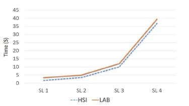 The time required increases when the sensitivity level (SL) is increased because the number of masks used in clustering increases when the number of sensitivity regions increase, which means more processing is required. The difference in performance between the system when using HSI and when using L*a*b color spaces is small, with a mean difference equals to two seconds. The HSI color conversion is two seconds faster than L*a*b color conversion.
