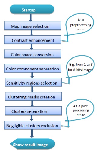 The proposed map clustering system uses image processing and machine learning techniques. Figure 2 illustrates the flowchart for the proposed system. The first stage after the system start up is to select the input map image. Then, that image is processed for contrast enhancement as a pre-processing stage. At this stage, the image color values distribution is changed to cover a wider range of colors.