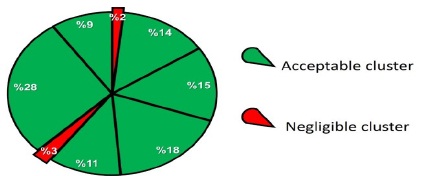 For each sensitivity level selection, a threshold is also selected for the acceptable area ratio for the clusters to ensure excluding the negligible clusters as a post-processing stage. This is important to only have clusters that actually represent something meaningful. When the sensitivity level is small, the threshold for the acceptable area ratio can have higher values than the threshold used when the sensitivity level is high because the number of colors included in small sensitivity regions is small, and therefore it is more likely to have small clusters which cannot be ignored. Figure 8 illustrates the cluster area ratios for eight clusters that represent the full area of an image including the negligible clusters. The clusters having an area ratio less than 5% were neglected.