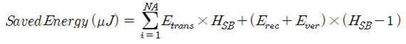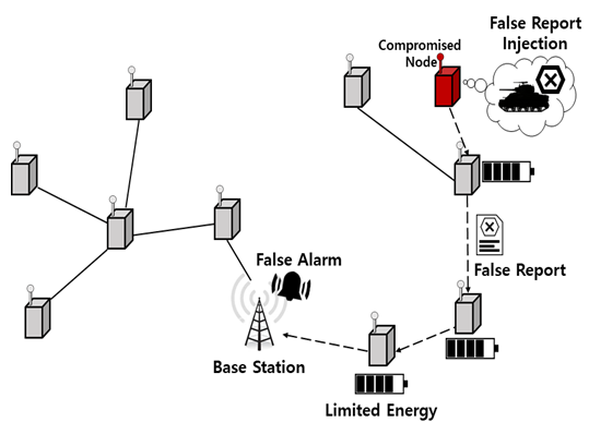 NA is the number of Repeat False Report Injection Attacks. Etrans refers to the transmission energy consumed at the node. HSB means the number of hops up to the BS from the location (source node) of the generated report. Erec refers to the reception energy that occurred at the next hop node (upstream neighbor node). Ever means the energy consumed during the verification process. The verification probabilities depend on the deployment environment of the nodes. Erec and Ever multiply by one less than the hop count because BS is not included in the network node energy. For example, if the Micaz mote nodes are deployed in the network and a 30byte report is generated at a distance of 21 hops from the BS, Etrans is 16.25 μJ * 30 bytes and HSB is 20. The energy consumed by the nodes will be described in detail in Chapter 4. In the above equation, one is reduced in HSB because filtering a false report can be done at the upstream neighbor node of the report generation node. Assuming that the probability of nodes verifying the report is 30%, the proposed scheme saves up to 17,325 μJ about one event.