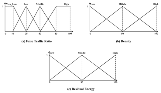 A fuzzy logic system generates a specific rule to represent situations with inaccurate states in a multidimensional manner [10]. The fuzzy system makes inferences about the ambiguous situation through rules. It is difficult to construct an adaptive system because the environment of a wireless sensor network is difficult to express in a mathematical model and continuously changes. Since the existing system has a static structure, it is not suitable for a system that expresses the environment flexibly depending on the situation. It is difficult to determine appropriate settings such as the nature of the attack, energy, and distribution, especially if the network administrator is not constantly monitoring the network environment. Fuzzy systems effectively solve these problems through inference systems [11]. A fuzzy system consists of rules and membership functions for making decisions on various input values.