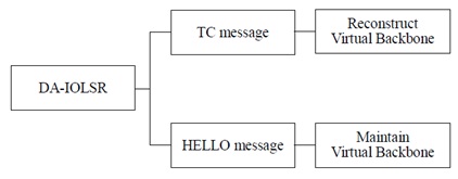 Figure 1 depicts the overall functioning of DA-IOLSR protocol. Upon reception of TC message, reconstruction of the virtual backbone from scratch is carried out using any of the available CDS algorithms. When HELLO messages are received, local topology information available through these messages is used to make changes, if required, to the CDS to compensate for the effects of the topology changes. The maintenance is also triggered upon HELLO message timer expiry.