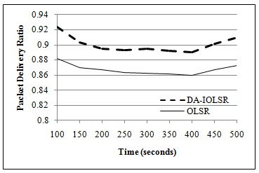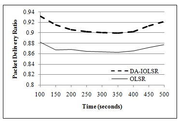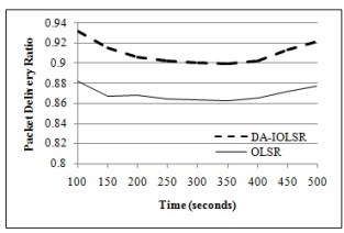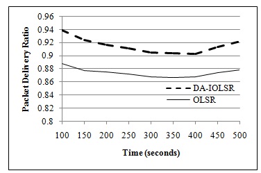 The performance of the DA-IOLSR protocol is compared with that of the OLSR protocol. The impact of mobility on packet delivery ratio of both the protocols is assessed with various node speed and pause time combinations.