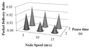 This section discusses the results pertaining to the performance of the protocols under varying mobility. Mobility is governed by the mobility model, node speed and pause time. Here, the random waypoint mobility model is used and the impact of various node speed and pause time combinations on the packet delivery ratio of DA-IOLSR and OLSR protocols is studied. For this, the node speed is varied as 5, 10 and 15 m/s, while pause time used is 2 seconds and 5 seconds.