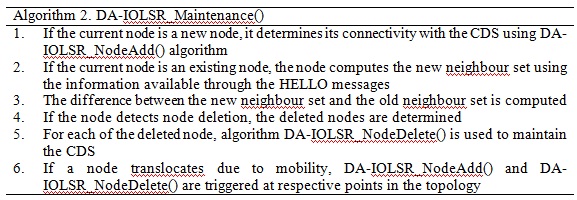 In DA-IOLSR protocol, decisions regarding maintenance of CDS are made based on the information available about the neighbours of the node under consideration. The local topology information that is available through the HELLO messages is used to maintain the CDS so that it remains connected upon addition, deletion and mobility of nodes. Thereby, the process of maintaining CDS is quicker and proves to be efficient in terms of network performance. The global topology information which is available upon the reception of TC messages is used to reconstruct the CDS.