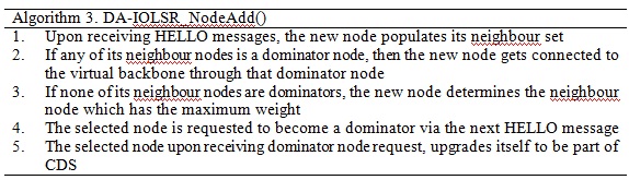 Three types of events induce topology change. They are node addition, node deletion and node mobility. A new node, on being added to the network, uses DA-IOLSR_NodeAdd() algorithm to determine its connectivity with the CDS. An existing node, upon reception of HELLO messages, detects the deletion of nodes, if any, in the time period between the reception of the current HELLO message and the previous HELLO message.
