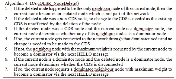The node using the information available from the current HELLO message, recalculates the neighbour set and compares it with the previously calculated neighbour set. If it detects deletion of a neighbour node, algorithm DA-IOLSR_NodeDelete() is called to make necessary changes, if required, to the CDS. In the case of HELLO message timer expiry, the new neighbour set would be empty, which denotes deletion of one or more existing neighbour nodes and hence algorithm DA-IOLSR_NodeDelete() is called. Node mobility is a special case of node addition and node deletion, wherein a node gets detached from one part of the network and gets attached to another part of the network. The above process is depicted in Algorithm 2.