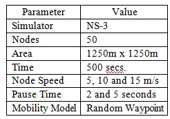 The performance of DA-IOLSR and OLSR protocols is examined using NS-3 simulator [42]. A network consisting of 50 nodes is considered, which is spread across an area of 1250m x 1250m. The mobility model that is used is random waypoint mobility model wherein the node speed is varied as 5, 10 and 15 m/s. Pause time used is 2 seconds and 5 seconds. Simulation is run for a total of 500 seconds. Multiple runs were executed to extract the average values. The simulation parameters are summarized in Table 1. The performance metrics and the simulation results are discussed in the subsequent sections.