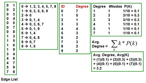 Figure 1 presents an illustration of the computation of the Avg(K), SD(K) and Kurtosis(K) for node degree for an example undirected graph of 10 vertices (whose list of edges is given). We first compute the node degree (the number of neighbours for a vertex) and determine the number of vertices that are of a particular degree. The probability of finding a vertex with a certain degree is simply the fraction of the total number of vertices with the particular degree. Once we have the k vs. P(k) values for a graph, we can compute the above three statistical metrics using formulations (1), (2) and (3).