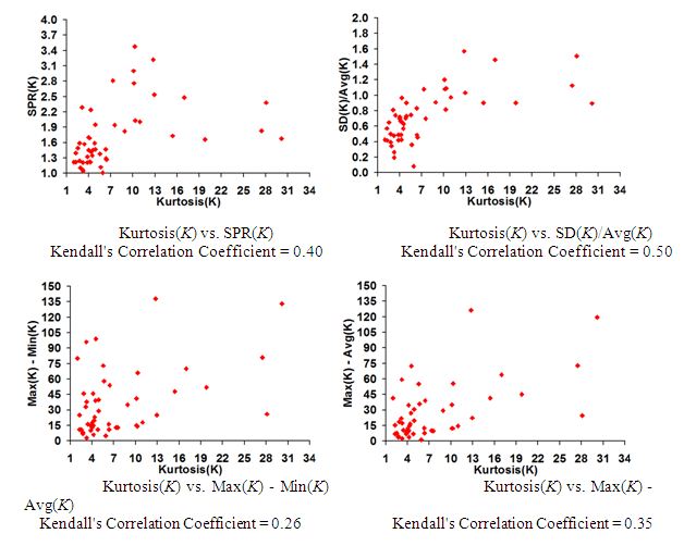 Figure 3. Distribution of the Kurtosis(K) Values vs. {SPR(K), SD(K)/Avg(K), Max(K)-Min(K) and Max(K)-Avg(K)} Values and the Kendall’s Correlation Coefficient for the 48 Real-World Networks
