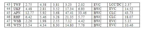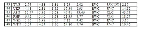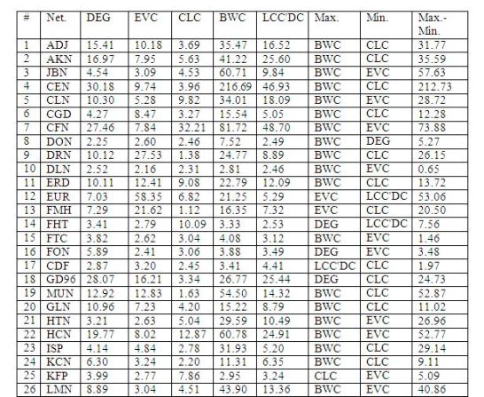 In this section, we present a comparison of the Kurtosis values for five centrality metrics (including degree centrality) that are widely applicable for complex network analysis. The centrality metrics considered (in addition to degree centrality, represented as DEG in this section) are eigenvector centrality (EVC), closeness centrality (CLC), betweenness centrality (BWC) and the local clustering coefficient complement-based degree centrality (LCC’DC). The EVC [52] of a vertex is a measure of the degree of the vertex as well as the degree of its neighbours. The CLC [53] of a vertex is a measure of the sum of the distances (typically the number of hops on the shortest path) of the vertex to the rest of the vertices in the network. The BWC [54] of a vertex is a measure of the fraction of the shortest paths that the vertex lies on between any two vertices in the network. While DEG and EVC are degree-based centrality metrics, CLC and BWC are shortest path-based metrics. The LCC’DC metric [55] is a computationally-light alternative to the computationally-heavy BWC metric. The LCC’DC (a hybrid of both the degree and shortest path-based metrics) of a vertex is computed as the product of the degree centrality of the vertex and the probability that any two neighbors of the vertex go through the vertex for shortest path communication (the latter is computed as the ratio of the number of pairs of neighbors of the vertex that are not directly connected to each other to that of the maximum number of pairs of neighbors of the vertex that could be directly connected to each other). Table 3 presents the Kurtosis values for the distributions of the five centrality metrics (DEG, EVC, CLC, BWC and LCC’DC) obtained for the 48 real-world networks.
