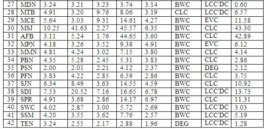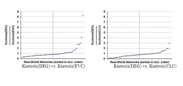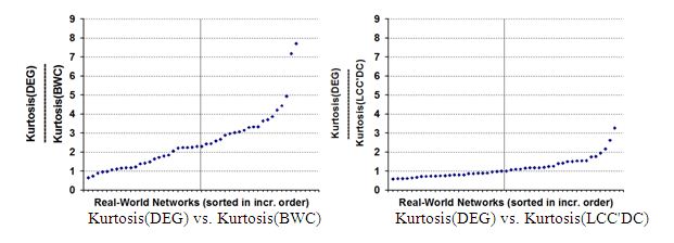 In Figure 4, we show the distribution of the Kurtosis(X)/Kurtosis(DEG) where X {EVC, CLC, BWC and LCC’DC} for the real-world networks. We observe the Kurtosis(BWC)/Kurtosis(DEG) ratios to be above 1 for 43 of the 48 (close to 90%) real-world networks, with a median of 2.30. On the other hand, the Kurtosis(EVC)/Kurtosis(DEG) and Kurtosis(CLC)/Kurtosis(DEG) ratios are below 1 for 32 and 37 of the 48 real-world networks (with medians of 0.82 and 0.75) respectively. In earlier works [55-56], the BWC and DEG metrics have been observed to exhibit a very strong correlation for several real-world networks. However, the above observations regarding the Kurtosis(DEG) and Kurtosis(BWC) values indicate that real-world networks are expected to be relatively more fat-tailed with respect to BWC compared to that of DEG. On the other hand, the lower values (lower than 1.0) for the Kurtosis(CLC)/Kurtosis(DEG) and Kurtosis(EVC)/Kurtosis(DEG) ratios for at least 2/3rds of the real-world networks indicate that real-world networks are likely to be less fat-tailed with respect to the EVC and CLC metrics vis-a-vis DEG. The median of the Kurtosis(DEG)/Kurtosis(LCC’DC) ratios is 1.00, indicating that the local clustering coefficient component of the LCC’DC formulation does not contribute to the fat-tailedness of the LCC’DC distribution. These are interesting observations that have been hitherto not reported in the literature.