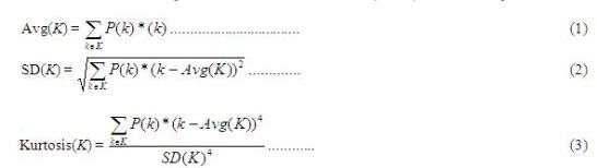 Let K be the set of all degree values for the vertices in a graph. Let P(k) indicate the probability of finding a vertex with degree k, where k K. The average, standard deviation and kurtosis for node degree are computed as follows: