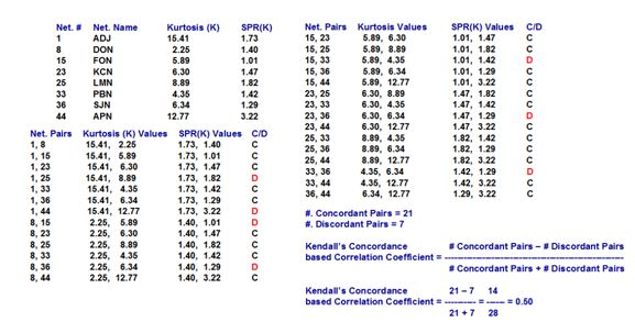 For the set of 8 real-world networks considered in Figure 2 and their Kurtosis(K) and SPR(K) values, we observe 21 concordant pairs of networks and 7 discordant pairs of networks; this leads to Kendall’s concordance-based correlation coefficient of (21-7) / (21+7) = 0.50.