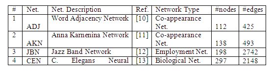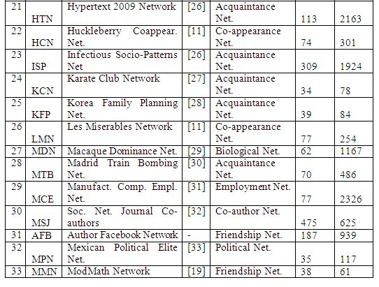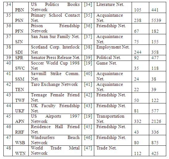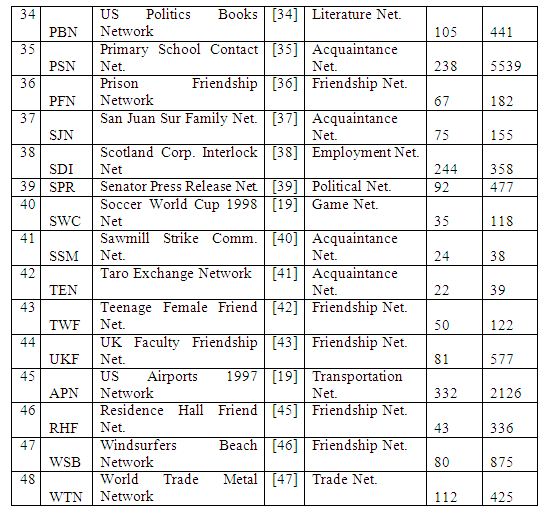 In this section, we first introduce the 48 real-world networks analyzed in this paper. Table 1 lists the three character code acronym, name and the network type as well as the number of nodes and edges. The networks considered cover a broad range of categories (as listed below along with the number of networks in each category): Acquaintance network (12), Friendship network (9), Co-appearance network (6), Employment network (4), Citation network (3), Literature network (3), Collaboration network (2), Political network (2), Biological network (2), Game network (2), Geographical Network, Transportation network and Trade network (1 each). A brief description of each category of networks is as follows: An acquaintance network is a kind of social network in which the participant nodes slightly (not closely) know each other, as observed typically during an observation period. A friendship network is a kind of social network in which the participant nodes closely know each other and the relationship is not captured over an observation period. A co-appearance network is a network typically extracted from novels/books in such a way that two characters or words (modelled as nodes) are connected if they appear alongside each other. An employment network is a network in which the interaction/relationship between people is primarily due to their employment requirements and not due to any personal liking. A citation network is a network in which two papers (nodes) are connected if one paper cites the other paper as a reference. A collaboration network is a network of researchers/authors who are listed as co-authors in at least one publication. A biological network is a network that models the interactions between genes, proteins, animals of a species, etc. A political network is a network of entities (typically politicians) involved in politics. A game network is a network of teams or players playing for different teams and their associations. A literature network is a network of books/papers/terminologies/authors (other than collaboration, citation or co-authorship) involved in a particular area of literature. A transportation network is a network of entities (like airports and their flight connections) involved in public transportation. A trade network is a network of countries/people involved in a certain trade. The reader is referred to [9] for a more detailed description of the individual real-world networks.