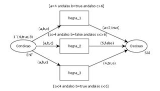 As the rules are inserted, they are grouped hierarchically, that is, the execution of the rules will depend on the sequence of decisions that occur in the Petri net. In Figure 4 the result of the insertion of three rules that compose a certain subset that make up the total of rules.