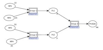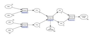 By inserting these rules in the Petri net, the knowledge generated by the expert is incorporated into the routine of monitoring the enterprise, alerting the manager in case of any decision implying non-compliance with the rules. Figure 5 shows the manufacturing process of a product from 4 raw materials, using three machines.