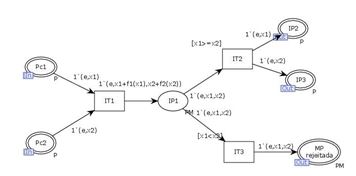 The operation of the machines specified by the Petri net of Figure 5 was defined by the manufacturing sector (ocupada=busy, livre=free, acabou=finished in portuguese).Subsequently, the quality control sector detected that the final product was not adequate, presenting a simple rule to improve product quality. If x1 of Pc1greater or equal x2 of Pc2, then complete the product, otherwise Pc1 and Pc2 should be directed for recycling, where x1 is the actual value of a parameter x for Part 1 and x2 is the actual value of the same parameter x for Part 2.