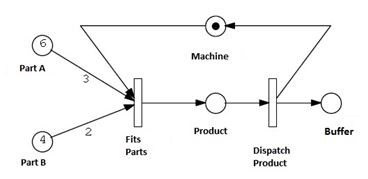 Figure 5. Petri net illustrating the manufacturing of a product from 4 raw materials
