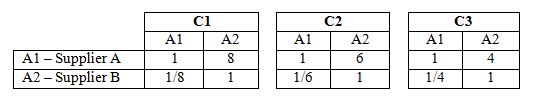 In this example, the comparisons between the criteria are shown in Table 5, in which the decision-maker judges the criteria pairs, obtaining the matrix of reciprocal judgments[11].