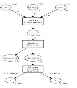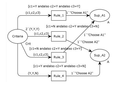 indicating that in this example the alternative A1 is much better than the alternative A2 and supplier A must be chosen. Figure 9 shows the Petri Net version of the initial decision table.
