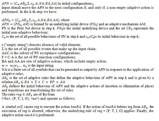 Another enhancement of Petri Net is Adaptive Coloured Petri Net (ACPN)[5]. Adaptive Coloured Petri Net introduces an adaptive layer which involves Coloured Petri Net, and are composed of several functions that are capable to change the subjacent network topology, including or excluding places, transitions and arcs. This paper describes how the adaptive layer operates and the way of transcribing the rules of the tables for extended functions of Petri nets. By embedding a decision table in a Petri net, the simulation and analysis tools available in the Petri net development environments can be used, which leads to an increase in confidence in the decision criteria adopted.