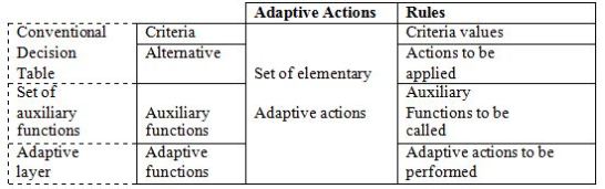 Adaptive functions constitute the adaptive layer of the adaptive device governed by rules. Modifying the rule set implies increasing the number of columns in the case of rule insertion, or decreasing the number of columns in the case of rule deletion. In both cases the amount of lines remains fixed. The Adaptive Decision Table (ADT) is capable to change its set of rules as a response to an external stimulus through the action of adaptive functions [11]. However, the implementation of more complex actions is not a simple task due to the limitation of the three elementary operations supported by ADT [11].