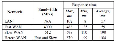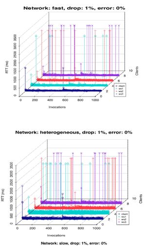 The result statistics shown in Table 1 clearly indicated the effectiveness of emulating the three different networks between the system components. The average RTT – without injecting drop and error faults – when emulating Fast WAN is 59ms, where the average RTT without using our tool in LAN is 57ms. That means the overhead delay introduced by our toolkit to the tested system is clearly insignificant. However the differences of the average response time between the Fast WAN and the Slow WAN is indeed big. That is related to the configurations of the two emulated networks, specifically the propagation delays and the bandwidths where in Fast WAN are 2ms, 4mb/s and in Slow WAN are 50ms, 512Kb/s respectively. When considering Heterogeneous WAN, the average response time is almost between the average response times of the Fast and Slow WANs. That is due to Heterogeneous WAN is configured of a combination of the other two WANs (Fast and Slow).