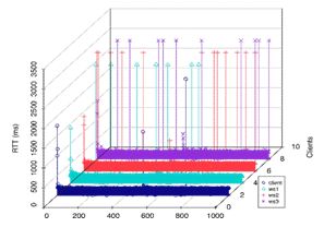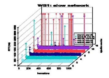 Figure. 3 shows the RTT to the three Web services logged by the WS-Mediator. It is very interesting to see the three Web services had much longer RTT at the very beginning of the test suggesting the RTT could have been optimized by some kind of caching mechanism employed in the Web services. It is also worth noting although the three replicated Web services have identical hardware, operating system, middleware, etc., WS3 constantly had longer delays than WS1 and WS2. However, the RTT variations of Web services and between different Web services are indeed insignificant compared with the delays to be injected by our toolkit. Therefore can be safely ignored. The average RTT of WS1, WS2 and WS3 are 10ms, 11ms and 12ms. The average client RTT was slightly smaller than 10ms, because it always uses the quickest response from the three Web services.
