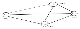 Figure 5 indicates a comparison of the RTT of the three Web services and the responses delivered to the client through the WS-Mediator. The ‘clients’ axis represents the invocation RTT monitored at each client thread (respectively deals with WS1, WS2, WS3) and the client application that deploys the WS-Mediator to deal with the results received by the client threads.